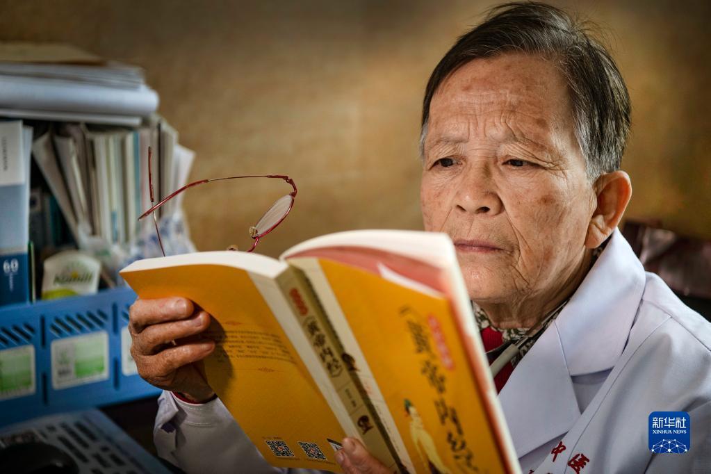 在陕西佳县中医院门诊义诊的路生梅,没有病人时坚持看书学习(2020年4月8日摄)。新华社记者 陶明 摄