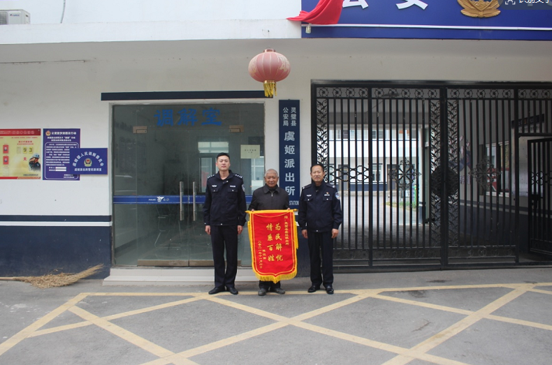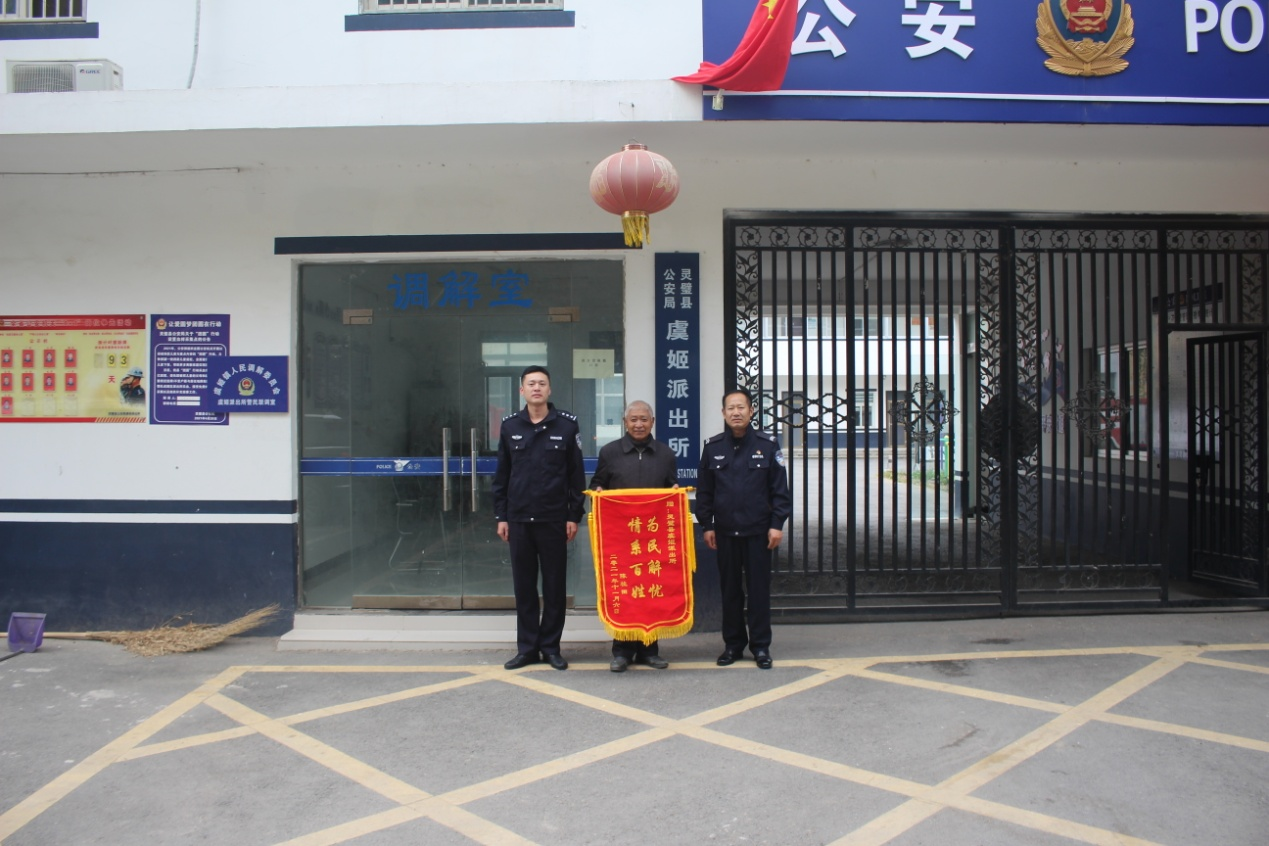 11月5日下午虞姬镇陈埝村陈某将一面印有“情系百姓、为民解忧”的锦旗送到虞姬派出所民警手中,对民警真情为民,履职尽责的行为表示感谢。