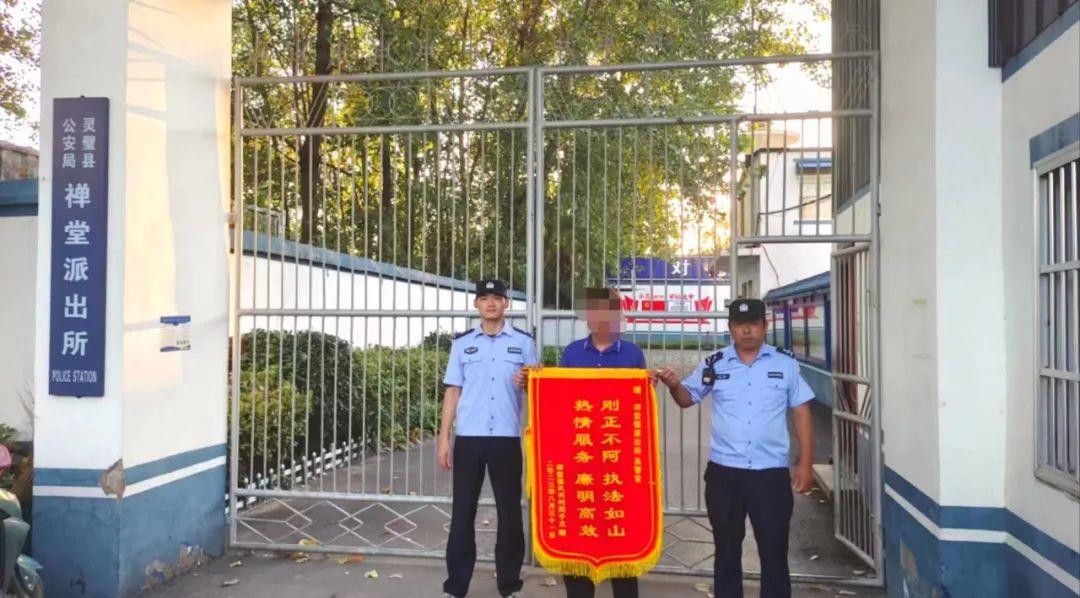 8月31日,禅堂镇居民闫先生专程来到灵璧县公安局禅堂派出所,将一面印有“刚正不阿 执法如山 热情服务 廉明高效”的锦旗送到办案民警手中,向公安机关及时破案挽损表示感谢。