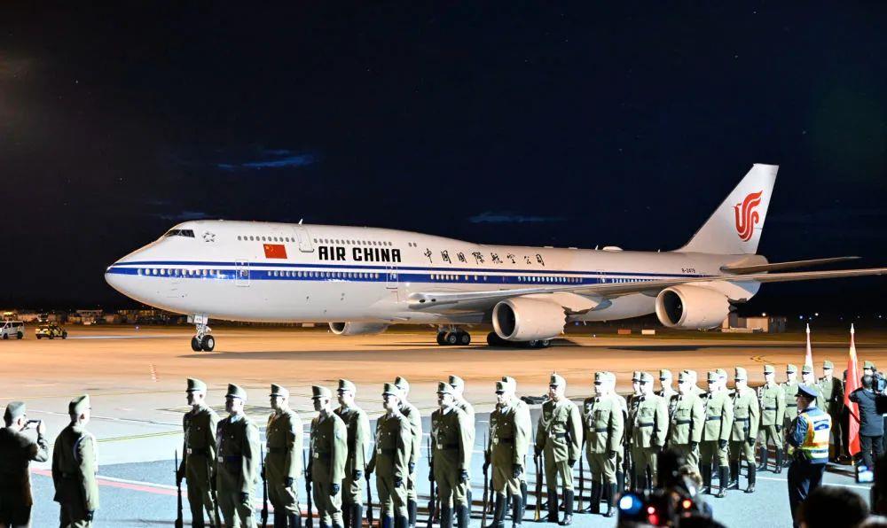 习近平主席夫人彭丽媛,中共中央政治局常委、中央办公厅主任蔡奇,中共中央政治局委员、外交部部长王毅等陪同人员同机抵达。