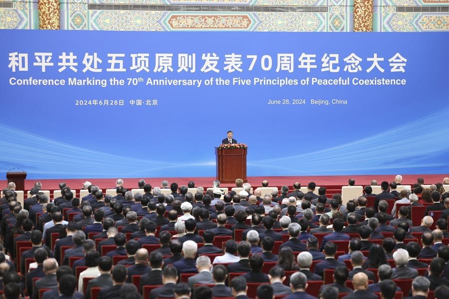 6月28日上午,和平共处五项原则发表70周年纪念大会在北京人民大会堂隆重举行。国家主席习近平出席纪念大会并发表题为《弘扬和平共处五项原则,携手构建人类命运共同体》的重要讲话。