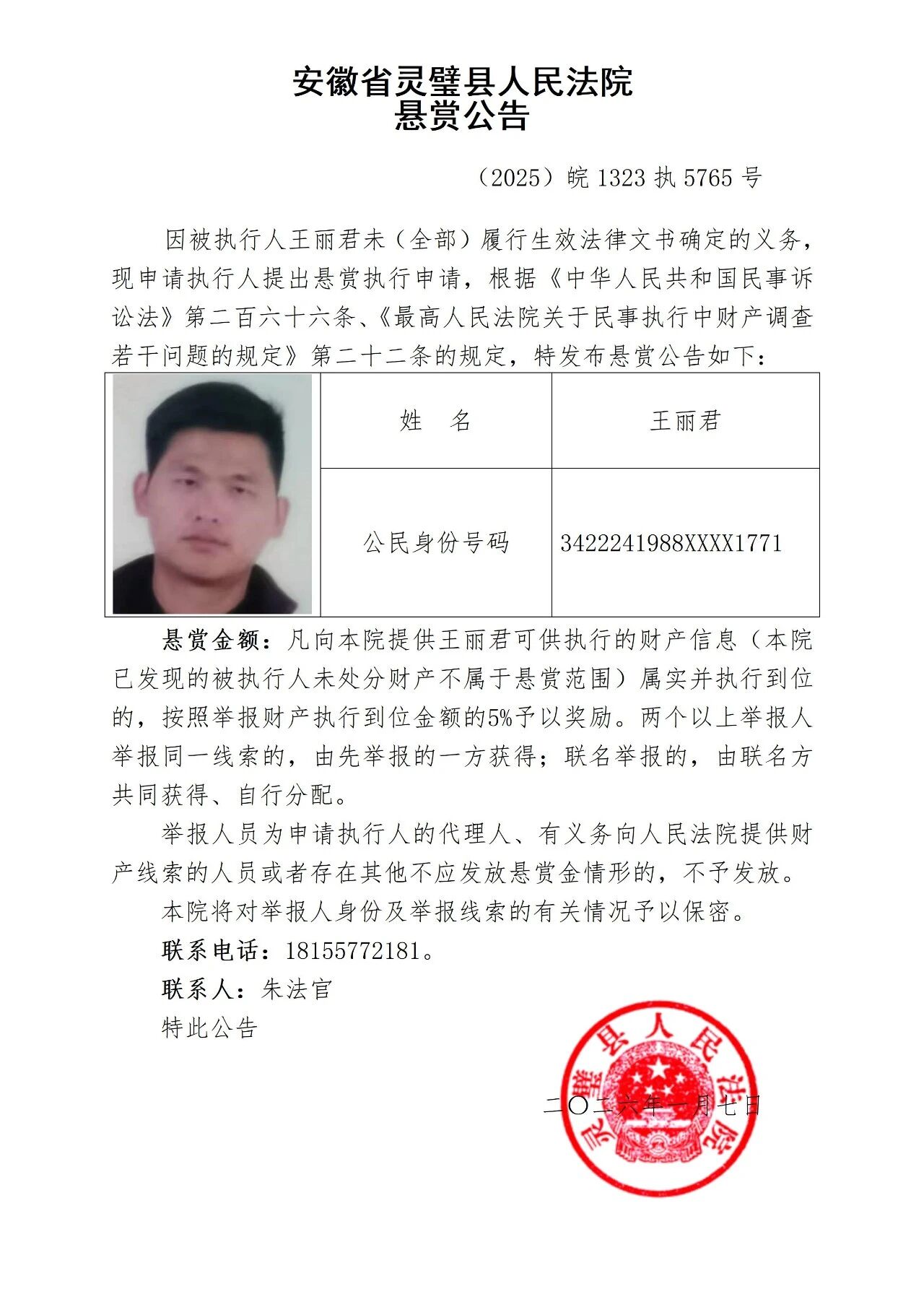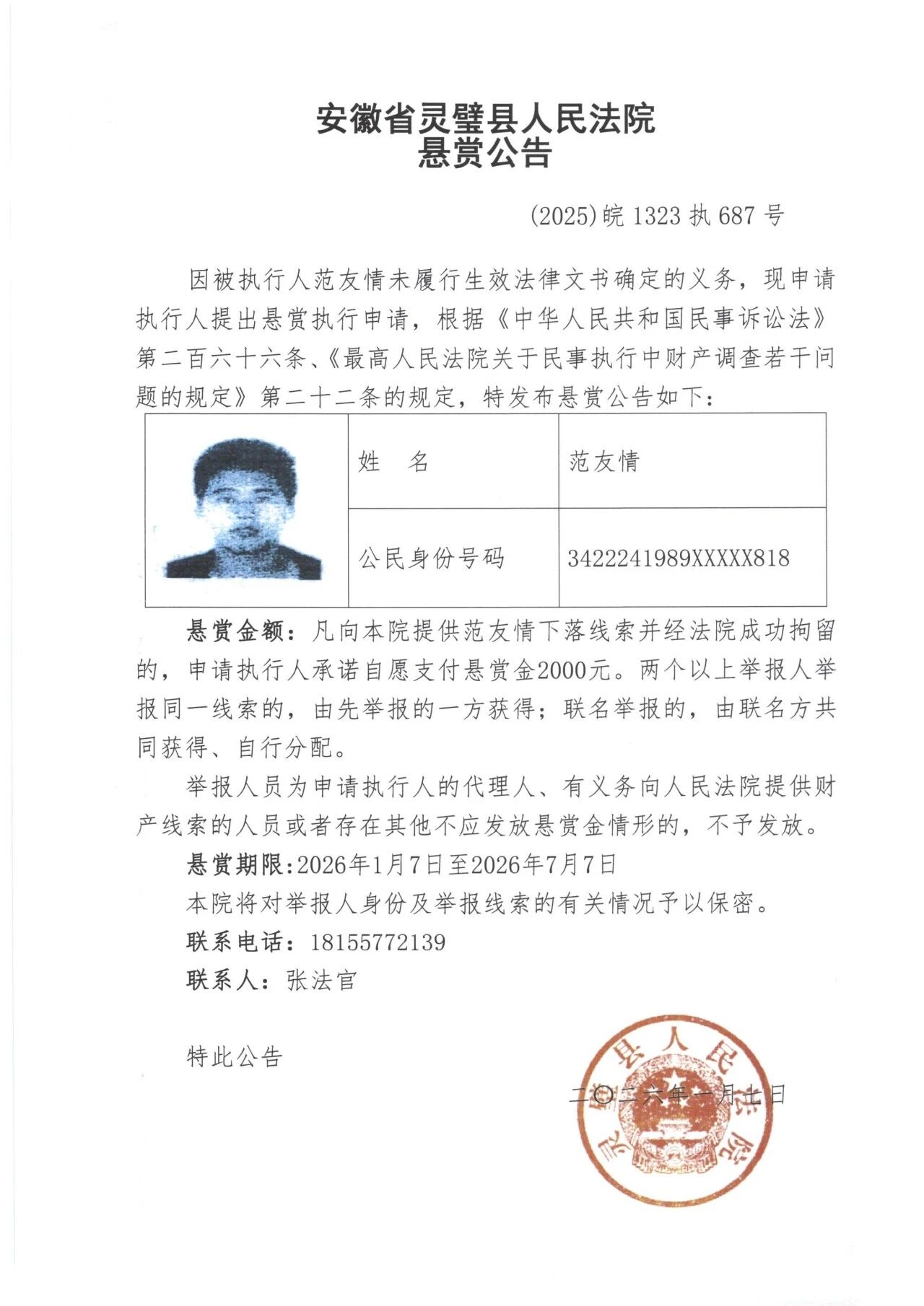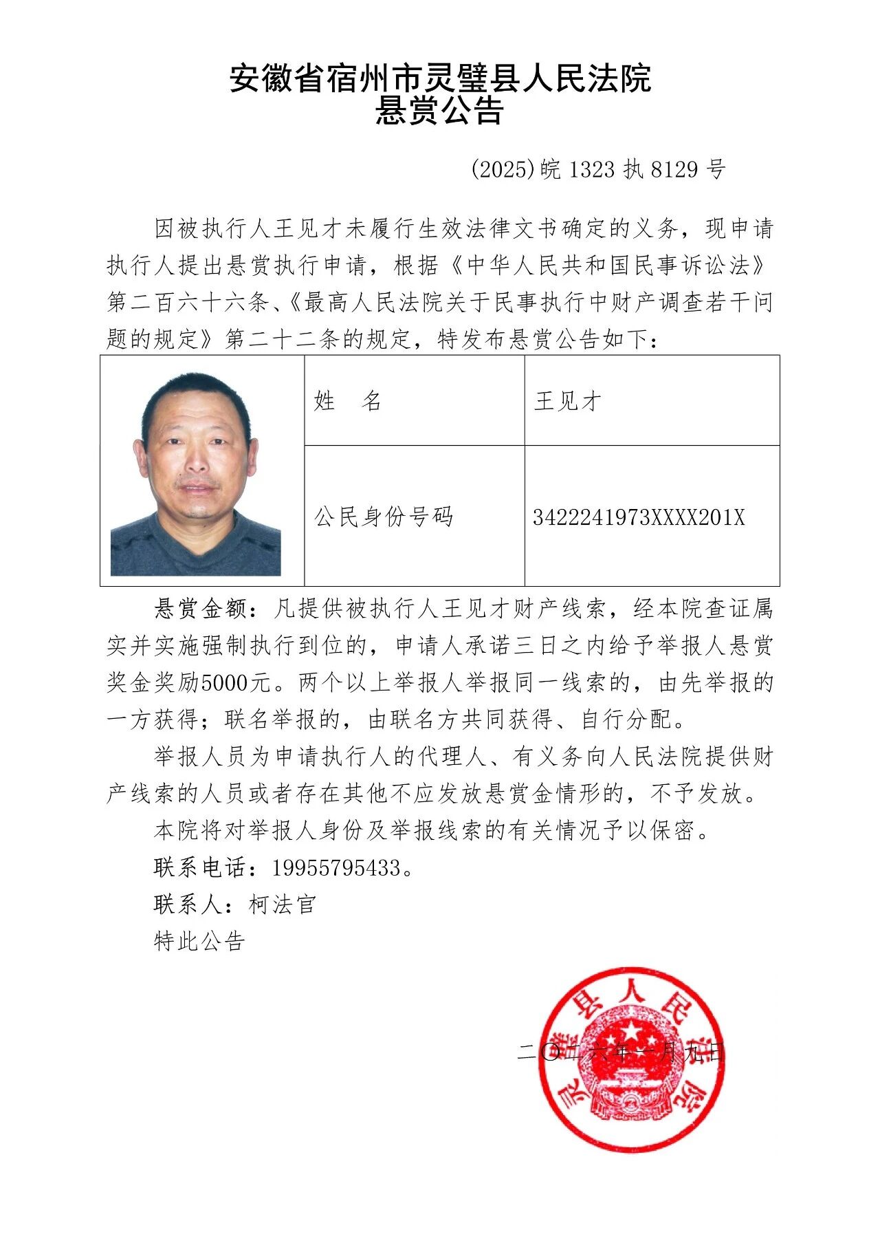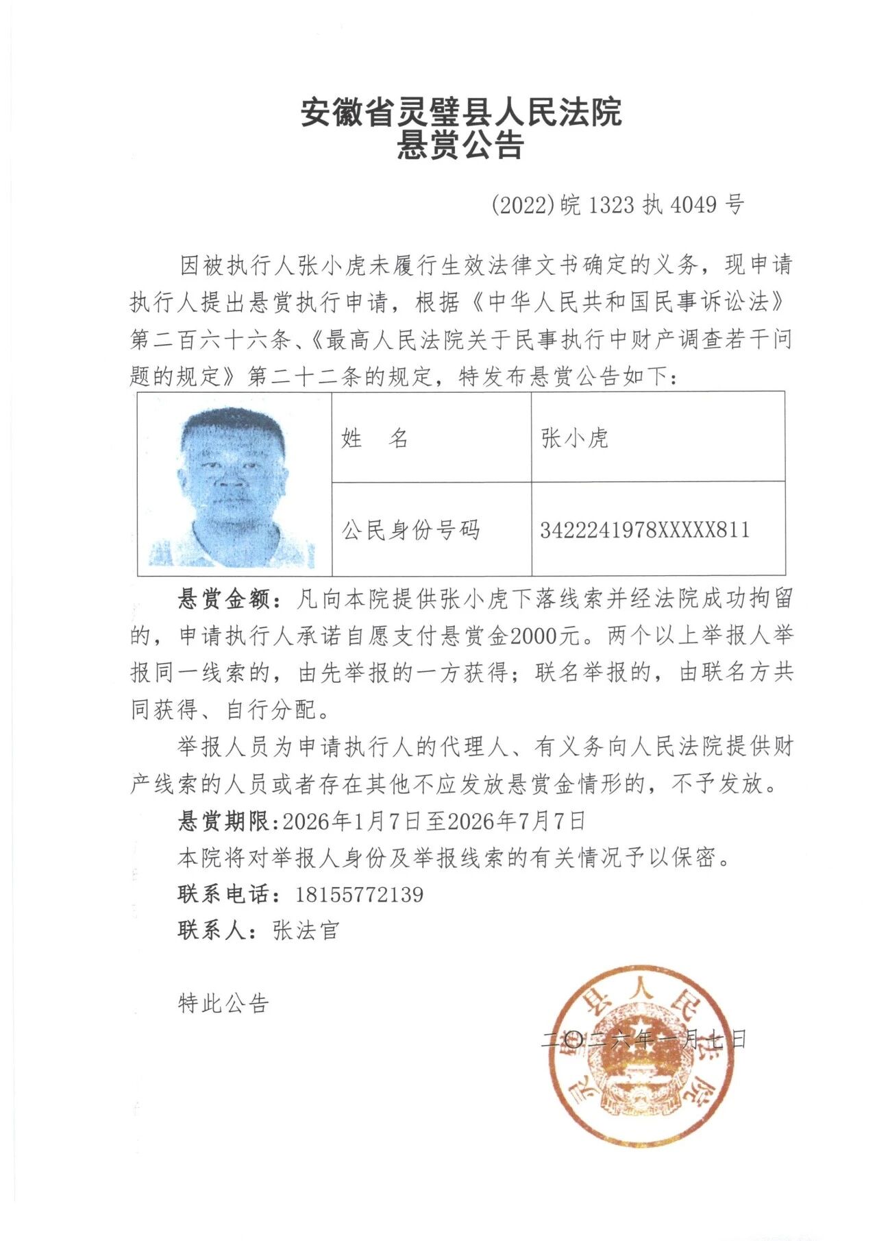 灵璧县法院发布失信被执行人悬赏公告