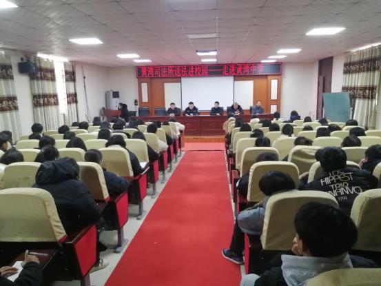 活动上,黄湾司法所所长梁宵给同学们普及了《未成年人保护法》与《预防未成年人犯罪法》,将刑法理论与实际案例相结合,就未成年人的刑事责任年龄、青少年犯罪的原因、特点及其预防问题做了深入浅出的剖析,使同学们增强了学法、守法、用法的自觉性,提高了自我保护和辨别是非的能力,对防止和减少在校学生犯罪起到了积极的作用。随后,结合校园欺凌、家庭暴力、电信诈骗等热点问题和相关案例,以通俗易懂的案例引导学生们防范各类侵害,遵纪守法、明辨是非,用法治思维和法治方式处理生活和学习中的难题。最后,给予同学们几点忠告,告诫同学们如何预防校园内外不法侵害,如何进行应对和自我防范等内容进行了仔细的讲解,增强青少年遵纪守法意识和安全防范意识。