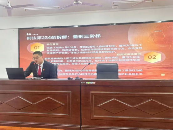 授课环节中,法官助理聚焦“故意伤害罪”,结合未成年人冲动滋事、口角升级等真实案例,讲解罪名构成、刑事责任年龄划分及犯罪后果,剖析暴力行为危害,引导同学们控制情绪、理性化解矛盾。围绕“盗窃罪”,以生活中常见情形切入,界定违法与犯罪界限,警示“顺手牵羊”“合伙盗窃”等行为的法律代价,倡导远离不良交友圈、提高防范意识。讲解内容深入浅出,易学易懂,获得了在校师生好评。(文/郭雪妮)