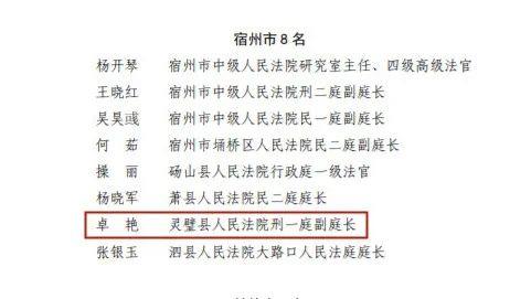 进一步激励女法官奋进新征程、建功新时代,日前,安徽省高级人民法院通报表扬了一批优秀女法官,灵璧法院刑一庭副庭长卓艳获评“全省法院优秀女法官”。