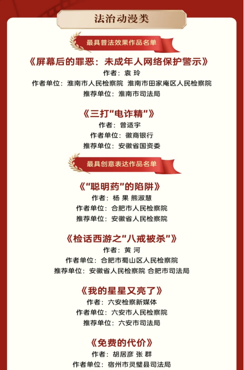 日前,由省委宣传部、省委网信办、省委依法治省办、省司法厅、省文旅厅联合开展的第八届“法润江淮 共筑美好安徽”法治动漫、微视频、漫画作品征集活动评选结果公布。