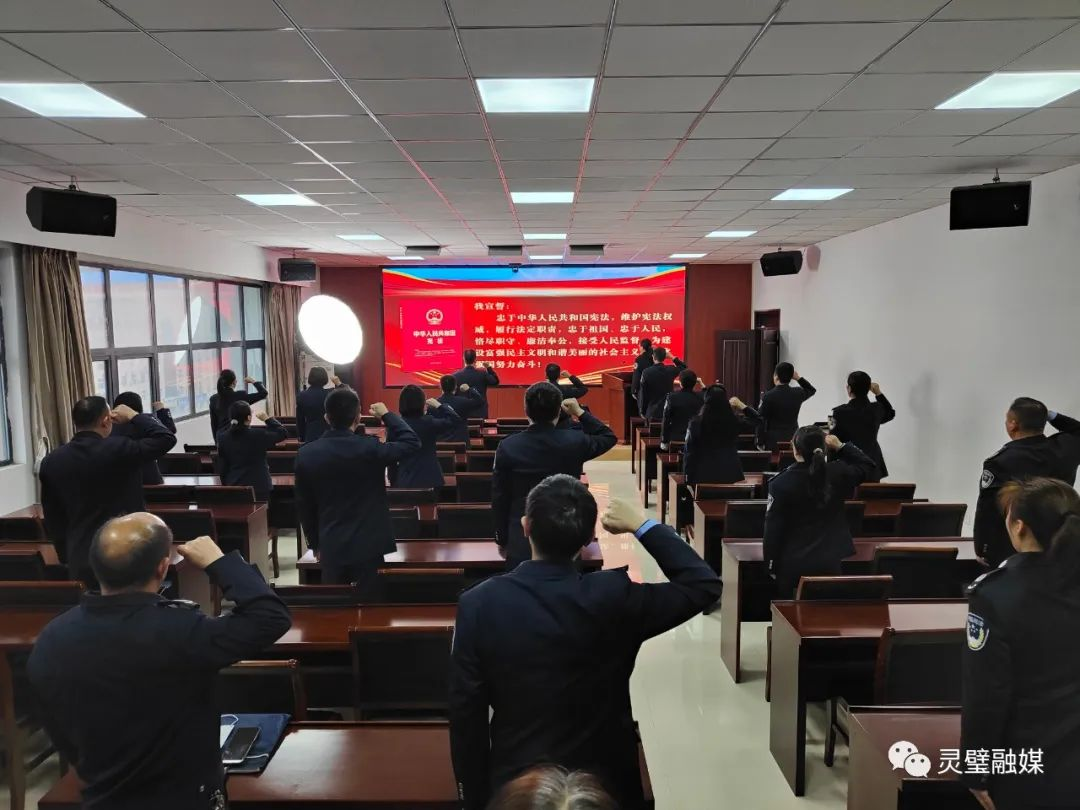 在灵璧县司法局会议室里,全体司法干警高举右拳,面对誓词,庄严宣誓。