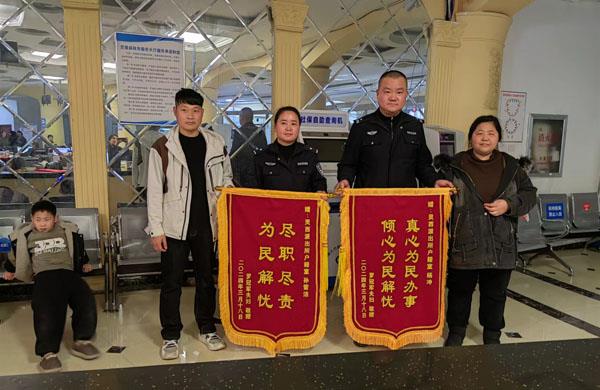 3月19日,罗先生和妻子专程来到县政务服务中心公安局户籍窗口将题有“真心为民办事 倾心为民解忧”、“尽职尽责 为民解忧”的两面锦旗送至民警手中。