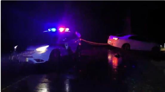 雨幕中,警灯闪烁在乡间小路,警车一路疾驰。赶到现场后,民警冒着大雨将救援绳系在被困车辆上,另一端系在警车车尾,来回尝试多次,最终将被困车辆拖出泥坑。