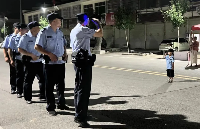 原来714日晚朱集派出所在开展夏季巡查宣防行动时在巡逻途中。一个穿着小警服的萌娃突然走到路边向巡逻人员敬礼,带队巡逻民警发现后随即停下脚步向其回敬,并向其及家人发出参观派出所的邀请。