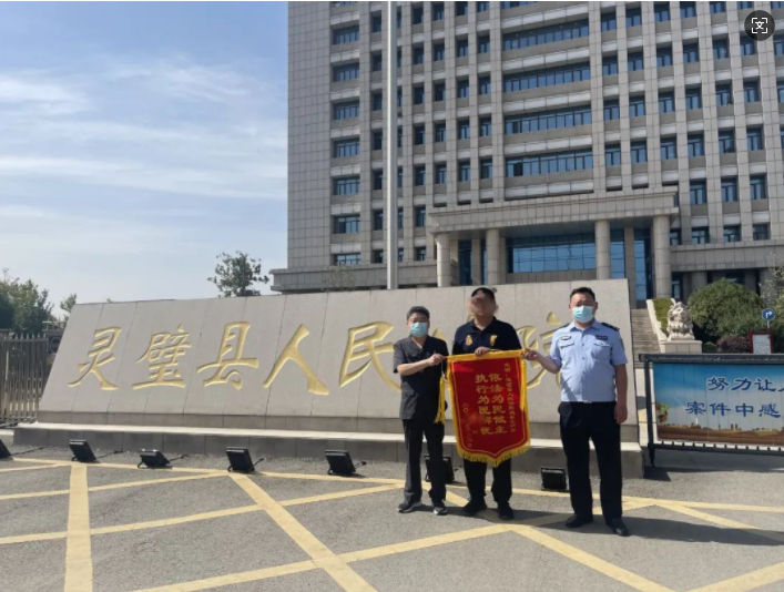 6月9日上午8点58分,灵璧县人民法院门口传来“噼里啪啦鞭炮声”,只见人群中一人手捧红通通的锦旗,要送给灵璧县法院执行局法官。