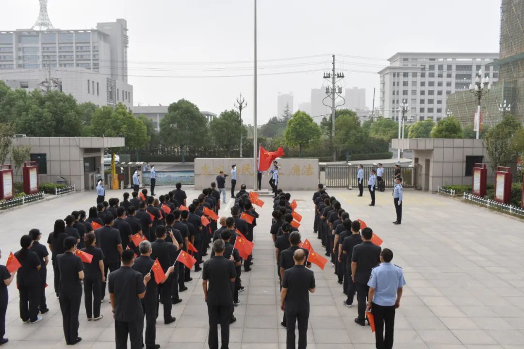 八点整,升旗仪式正式开始。随着庄严嘹亮的国歌声,鲜艳的红星红旗冉冉升起,干警们整装肃静,怀着无比激动的心情和崇高的敬意面向国旗,同唱国歌,向伟大祖国致敬。升旗仪式结束后,干警们齐唱《没有共产党就没有新中国》《歌唱祖国》等爱国歌曲。