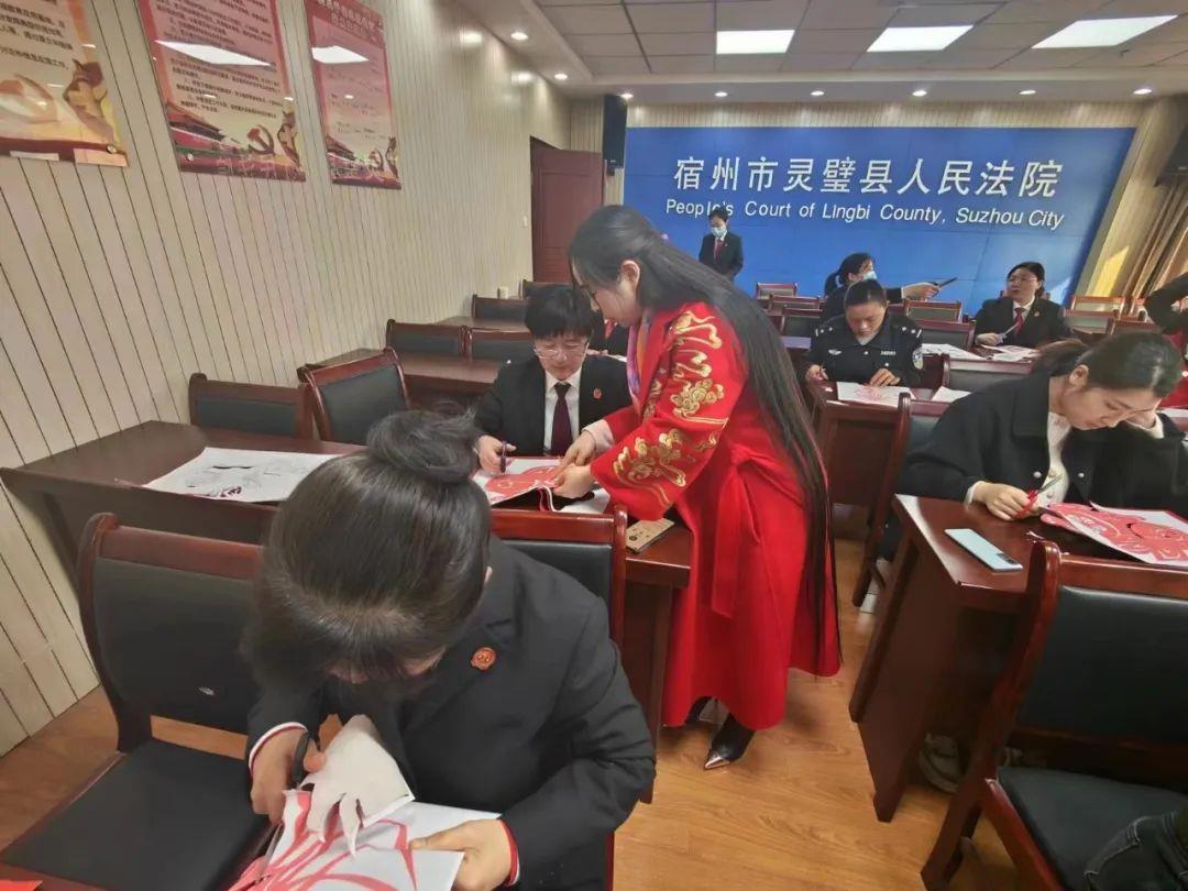 3月7日,灵璧县法院邀请宿州市人大代表、安徽省美术家协会会员、省级非物质文化遗产项目市级传承人李文老师亲临现场指导我院女干警参与非物质文化遗产剪纸活动。