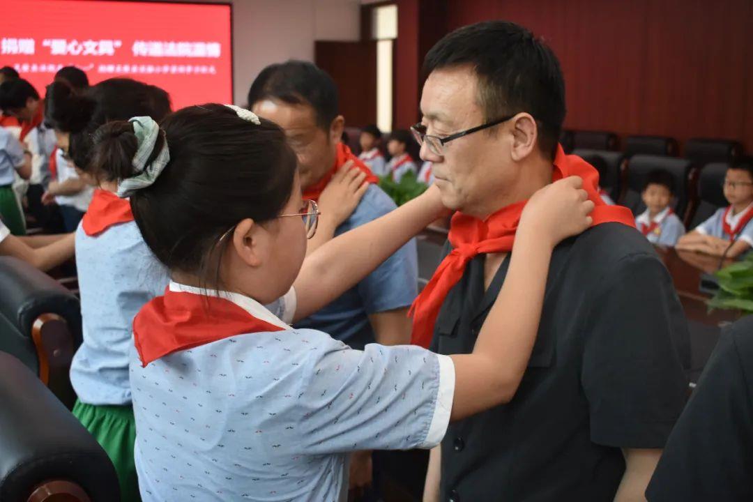 讲座结束后,少先队员们还为干警系上红领巾,干警们为品学兼优的贫困学子发放书包等学习用具以及《灵璧县人民法院法治副校长给孩子们的一封信》、《家庭教育促进法》等宣传材料,勉励学生们奋发图强,传承爱的接力棒。学生们纷纷表示感谢法院送去的关怀,以后会遵纪守法,努力学习,回报社会。传承“红领巾”文化,做好新时代的优秀少先队员。