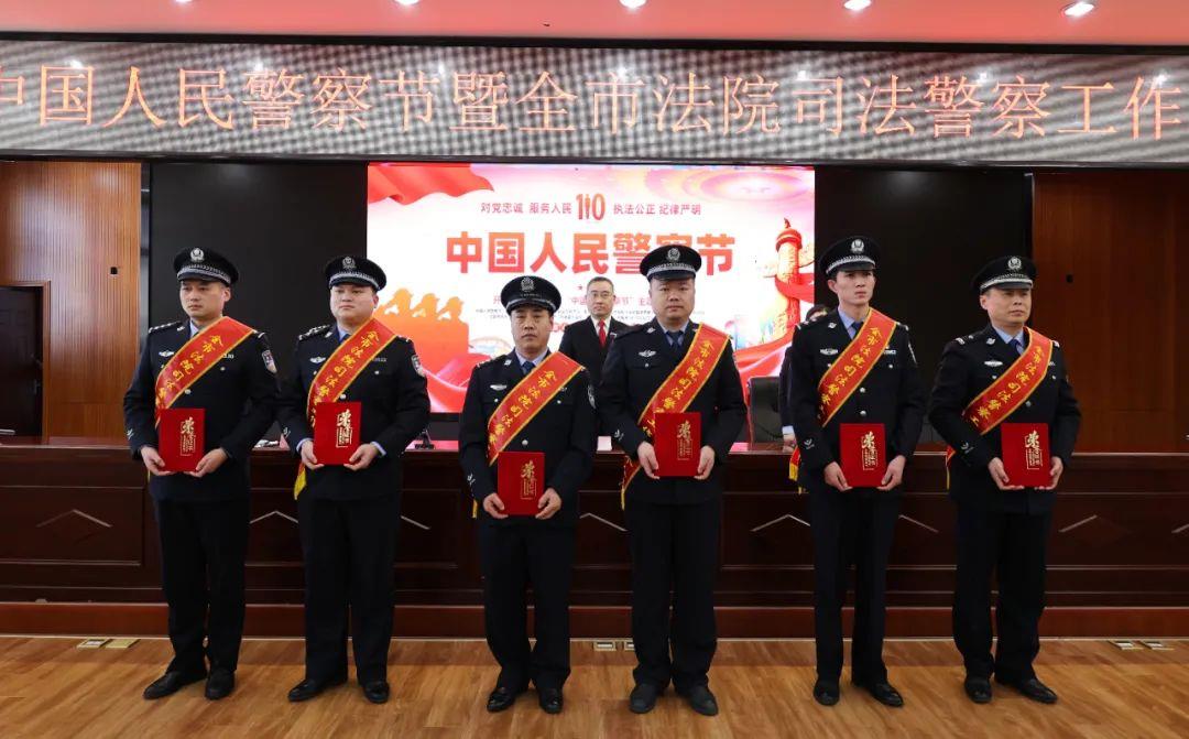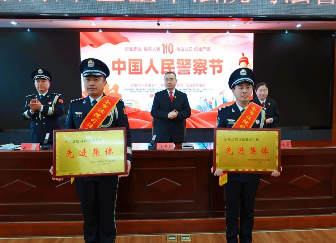 1月10日,宿州市中级人民法院召开司法警察表彰大会,灵璧县人民法院司法警察大队荣获全市法院司法警察工作“先进集体”,崔勇、张毅同志被评为全市法院司法警察工作“先进个人”。