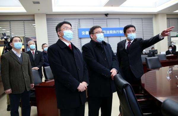 安徽长安网讯 1月19日上午,省委常委、政法委书记张韵声到省高院调研。调研中,张韵声参观了省高院诉讼服务中心、执行指挥中心和司法陈列馆,观看了扫黑除恶专项斗争和“江淮风暴”执行攻坚专题片,听取了省高院2020年工作情况介绍。省高院党组书记、院长董开军,省委政法委常务副书记汪莹纯陪同调研。