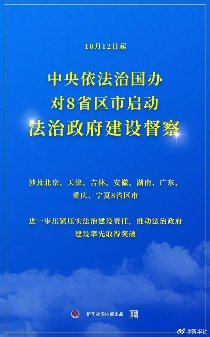 由中央依法治国办牵头,中央纪委国家监委机关、中组部等20多个部门参与的督察组,12日启程前往全国8个省区市,开展为期一周的法治政府建设督察。督察将通过听取群众意见、查阅工作资料、明察暗访等方式,全面了解各地推进法治政府建设、解决法治领域突出问题、推进法治领域重点改革任务等情况。