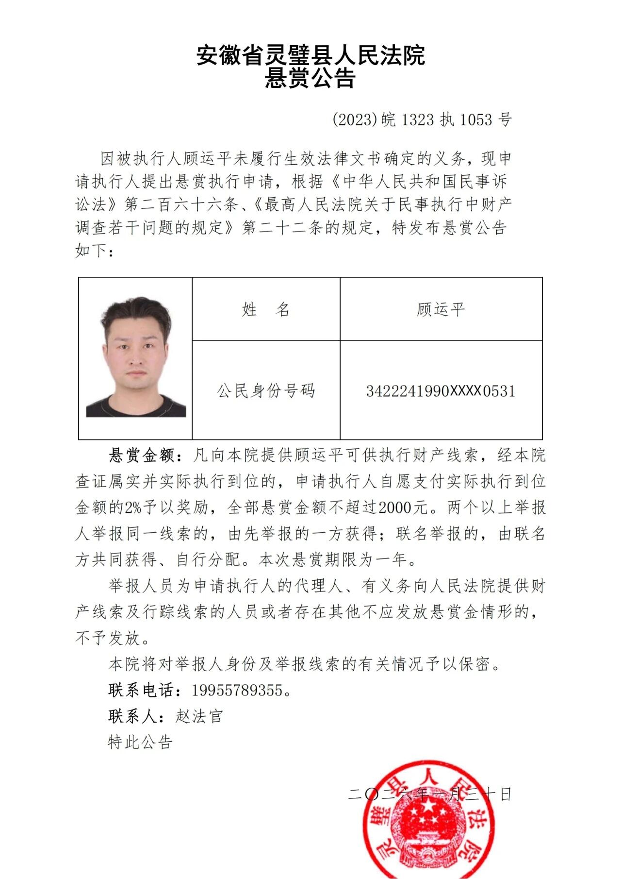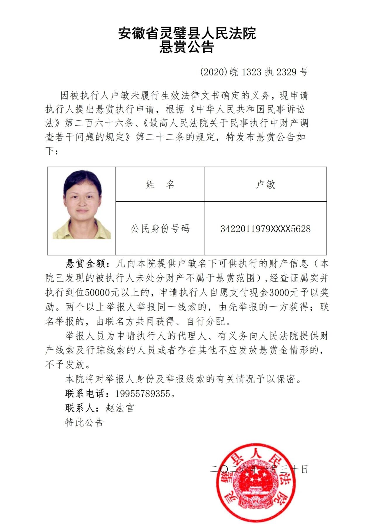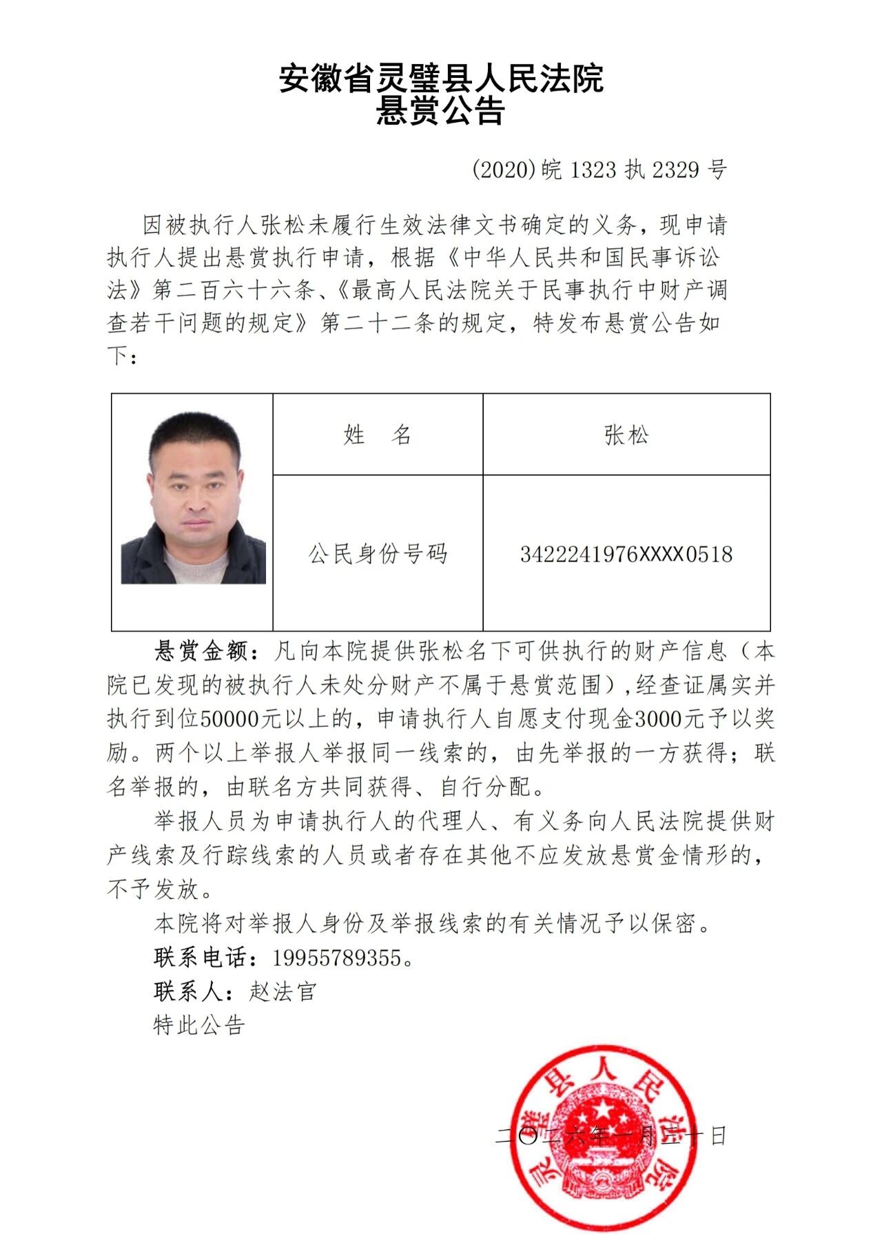 灵璧县法院发布失信被执行人悬赏公告