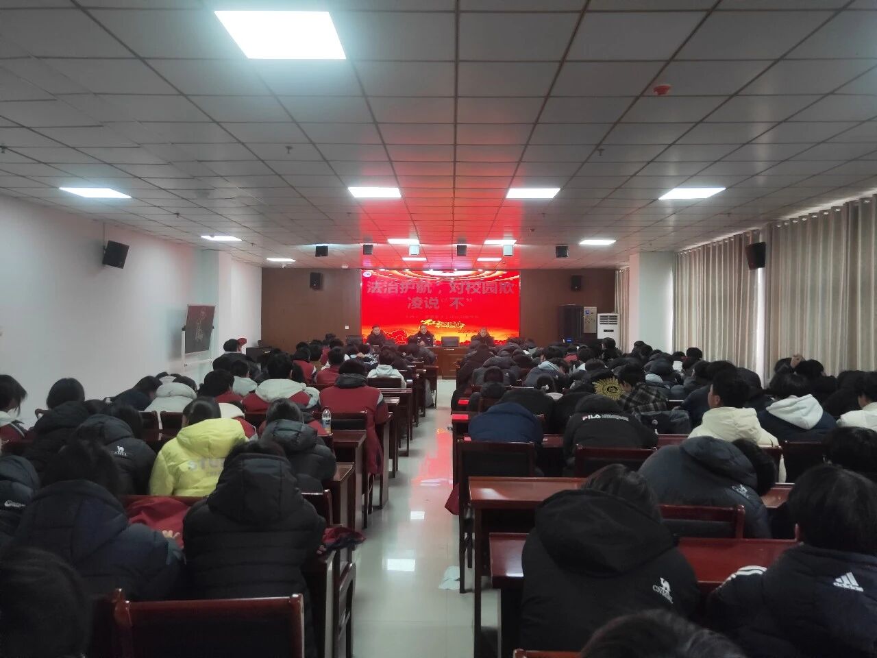 现场,民警围绕禁毒防毒、消防安全、交通安全、安全文明上网以及预防未成年人违法犯罪等内容,用通俗易懂的语言和情景模拟,提醒学生们提高法治观念和安全防范意识,引导学生树立尊法、学法、守法、用法的法治观念。同时,针对冬季校园安全隐患,提醒注意用火用电安全,增强自我防护能力,为青少年健康成长筑牢法治安全屏障。