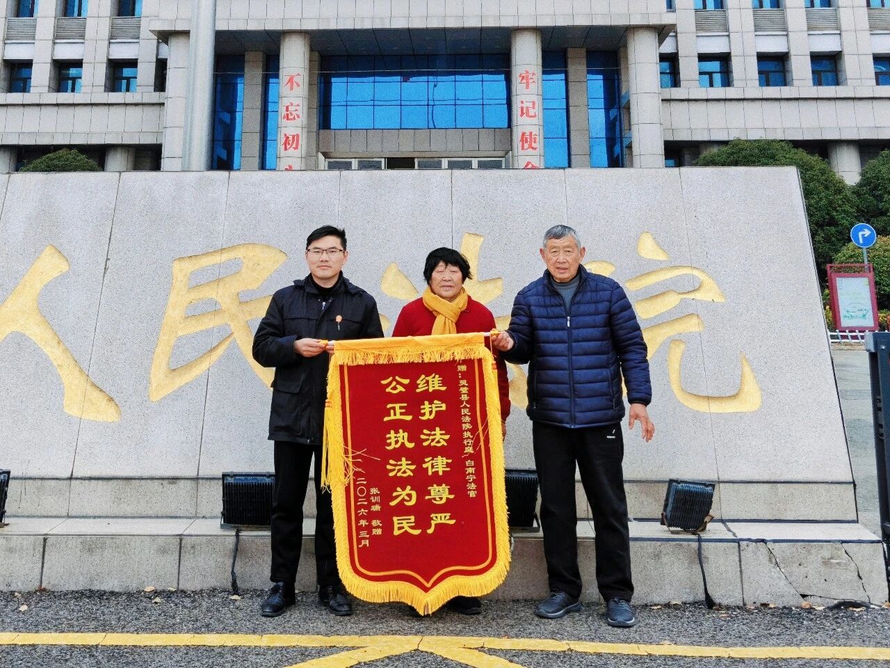 3月11日上午,灵璧县法院执行局干警白南宁收到一面印有“公正执法为民 维护法律尊严”的锦旗,申请人激动地说:“真的太感谢你们了!真正做到了让我的胜诉权益得以实现。”
