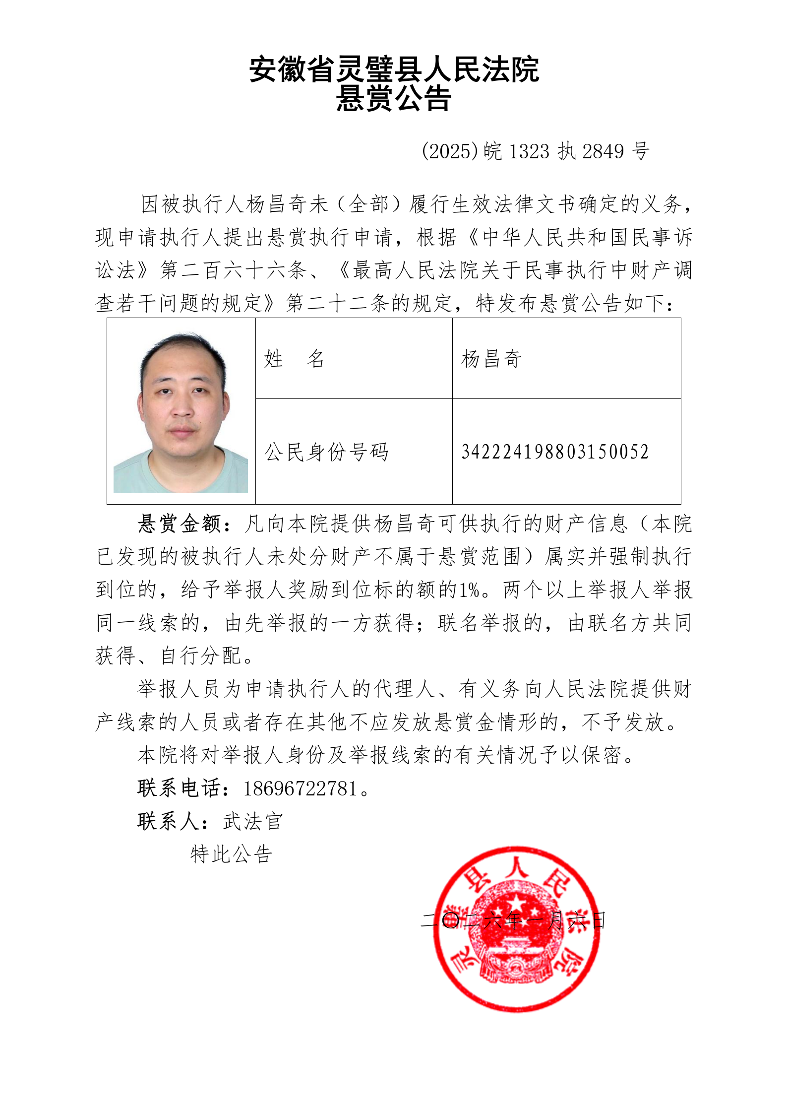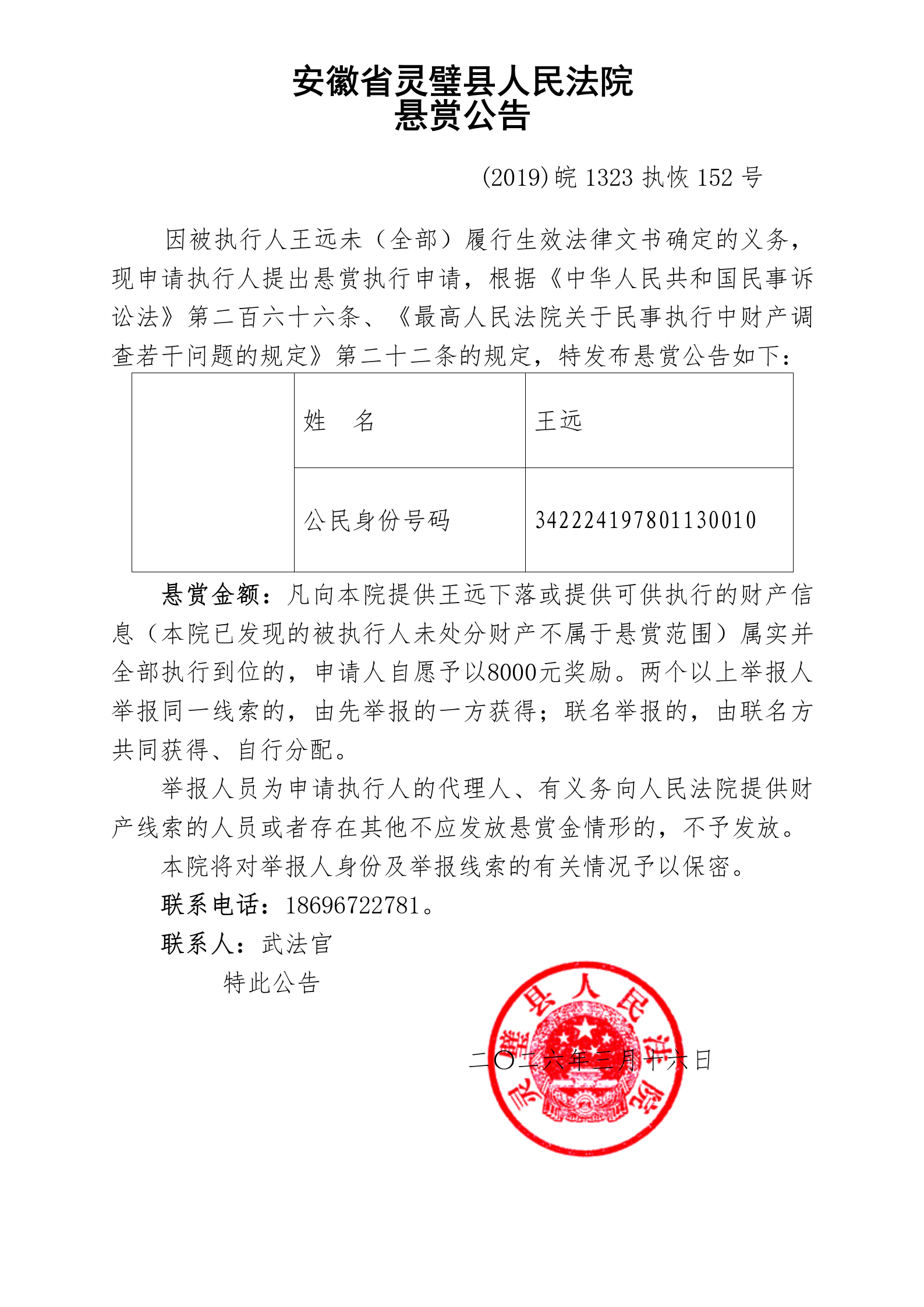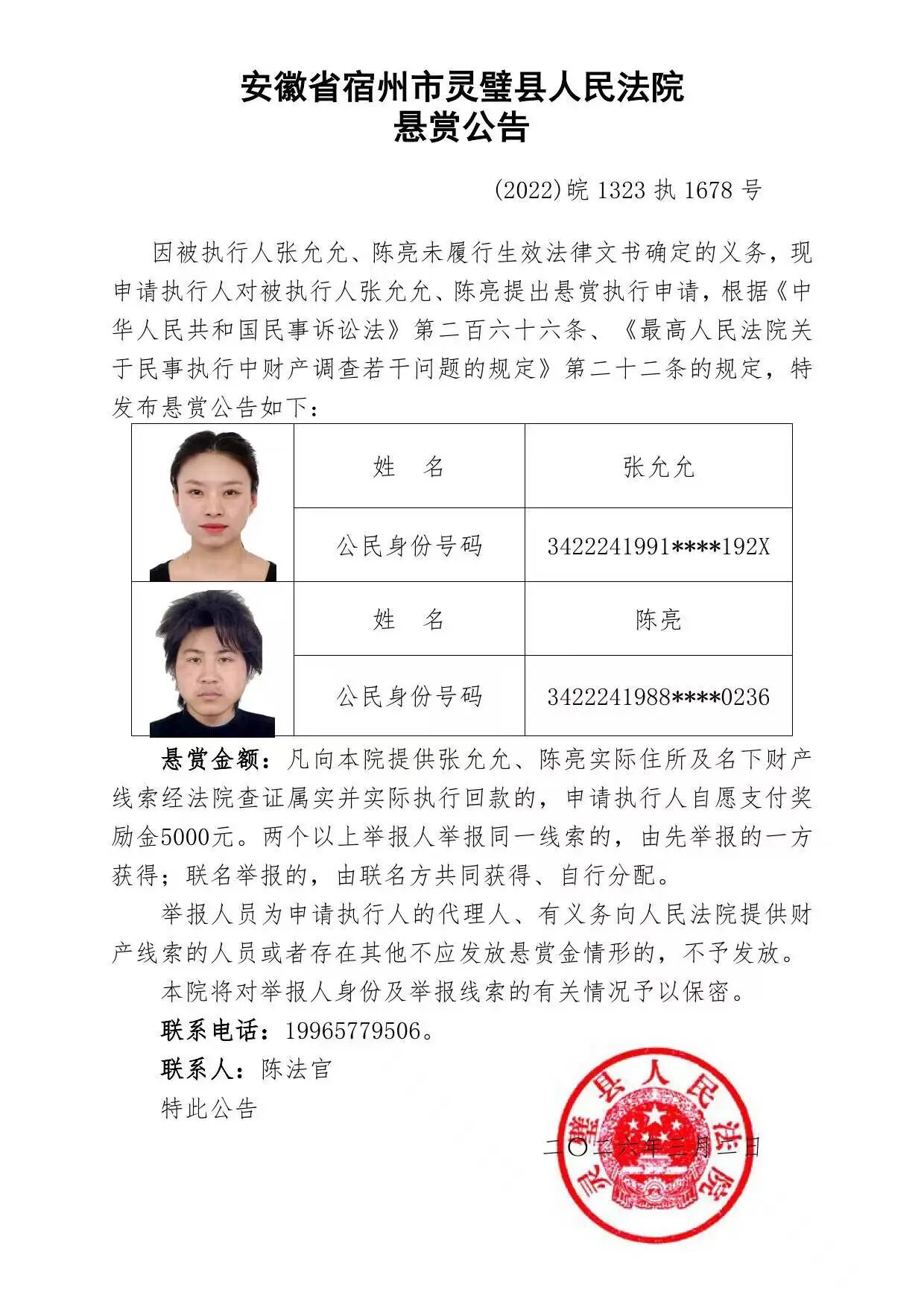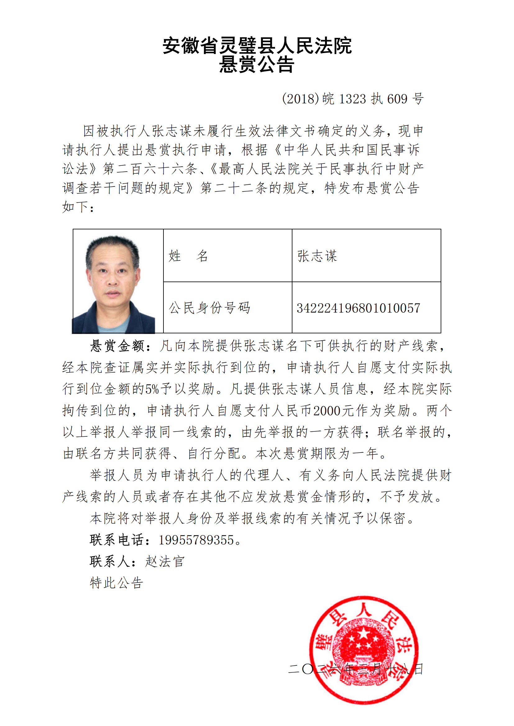 灵璧县法院发布失信被执行人悬赏公告