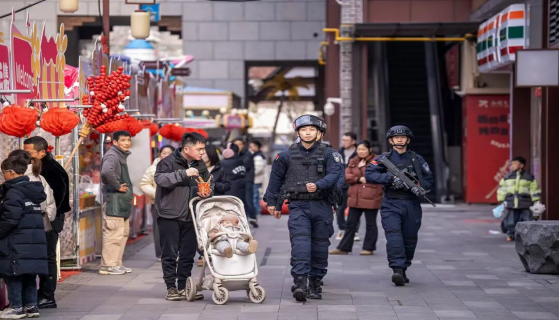▲浙江省长兴县公安局巡特警大队积极开展街面巡逻工作,全力筑牢新春安全防线。图为2月11日,巡特警队员在人员密集场所开展武装巡逻。方金华摄(法治日报)