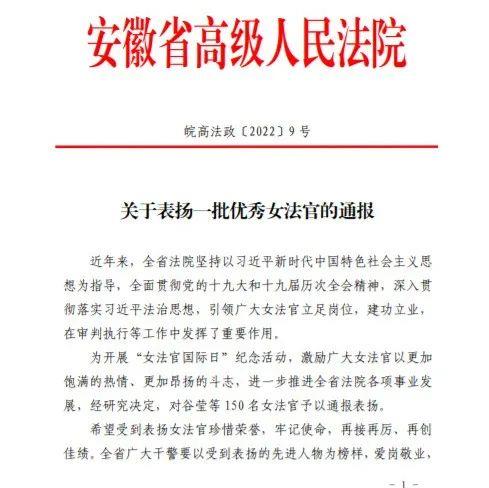 进一步激励女法官奋进新征程、建功新时代,日前,安徽省高级人民法院通报表扬了一批优秀女法官,灵璧法院刑一庭副庭长卓艳获评“全省法院优秀女法官”。
