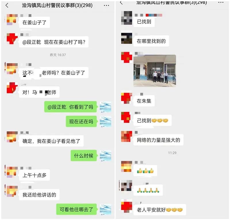 9月24日下午,浍沟镇凤山村马某报警,称其父(退休教师)时常健忘,于当日早上走失,家人四处寻找未果,请求派出所帮忙查找。接警后,浍沟派出所民警立即开展寻找工作,并将老人走失信息发布在浍沟镇凤山村“警民议事群”,看到信息的村民很快认出走失老人是村里的老教师马老师,于是纷纷转发。