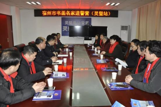 在灵城派出所会议室举行的书画艺术家走进警营见面会上,嘉宾们观看了《投资福地 魅力灵璧》专题片,对灵璧县委县政府近年来加快社会经济发展,提升民生福祉取得的长足进步赞不绝口。梁霆局长在致辞中代表局党委,对各位书画艺术家百忙之中走进灵璧警营表示了热烈的欢迎和衷心的感谢。他说,只有热爱灵璧这片土地,才能热爱灵璧公安工作。警营文化是公安队伍展的源泉,灵璧公安的发展离不开强有力的警营文化支撑。希望各位书画艺术界的老师和朋友借此深入警营机会,笔歌墨舞,尽情挥洒,用翰墨书写民警心声、激励民警担当,激发警营正能量,唱响警营主旋律。让基层民警们近距离领略各位老师书画艺术的独特魅力,提升民警文化素养和文化品味,在欣赏和感受中陶冶情操,增长知识,进一步丰富警营生活。
